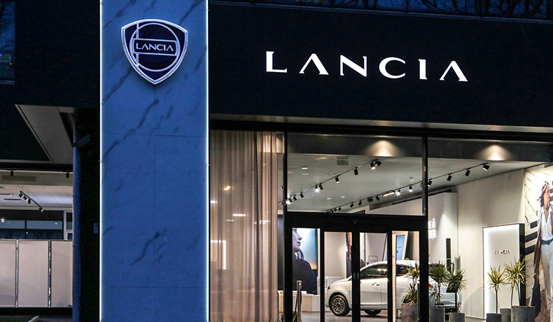 Lancia Pu+Ra HPE, le nouveau manifeste de la marque exposé devant le Cassina Store de Milan.