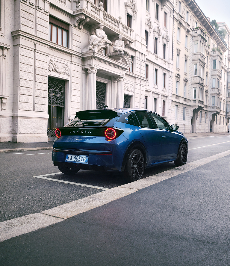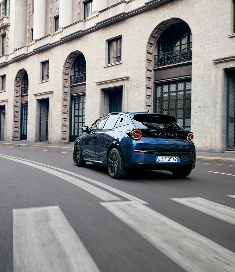 La face avant réinterprète la calandre historique de Lancia : le calice, avec trois faisceaux LED qui rendent la voiture electrique compacte reconnaissable de jour comme de nuit. À l'arrière, les phares à LED sont un hommage clair à la Lancia Stratos, une légende du rallye.